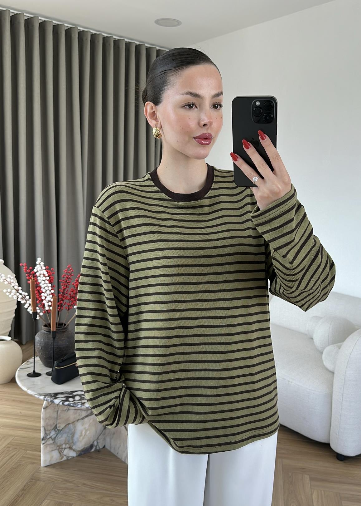 Çizgili Örme Oversize Bluz HAKİ (Gx4141)