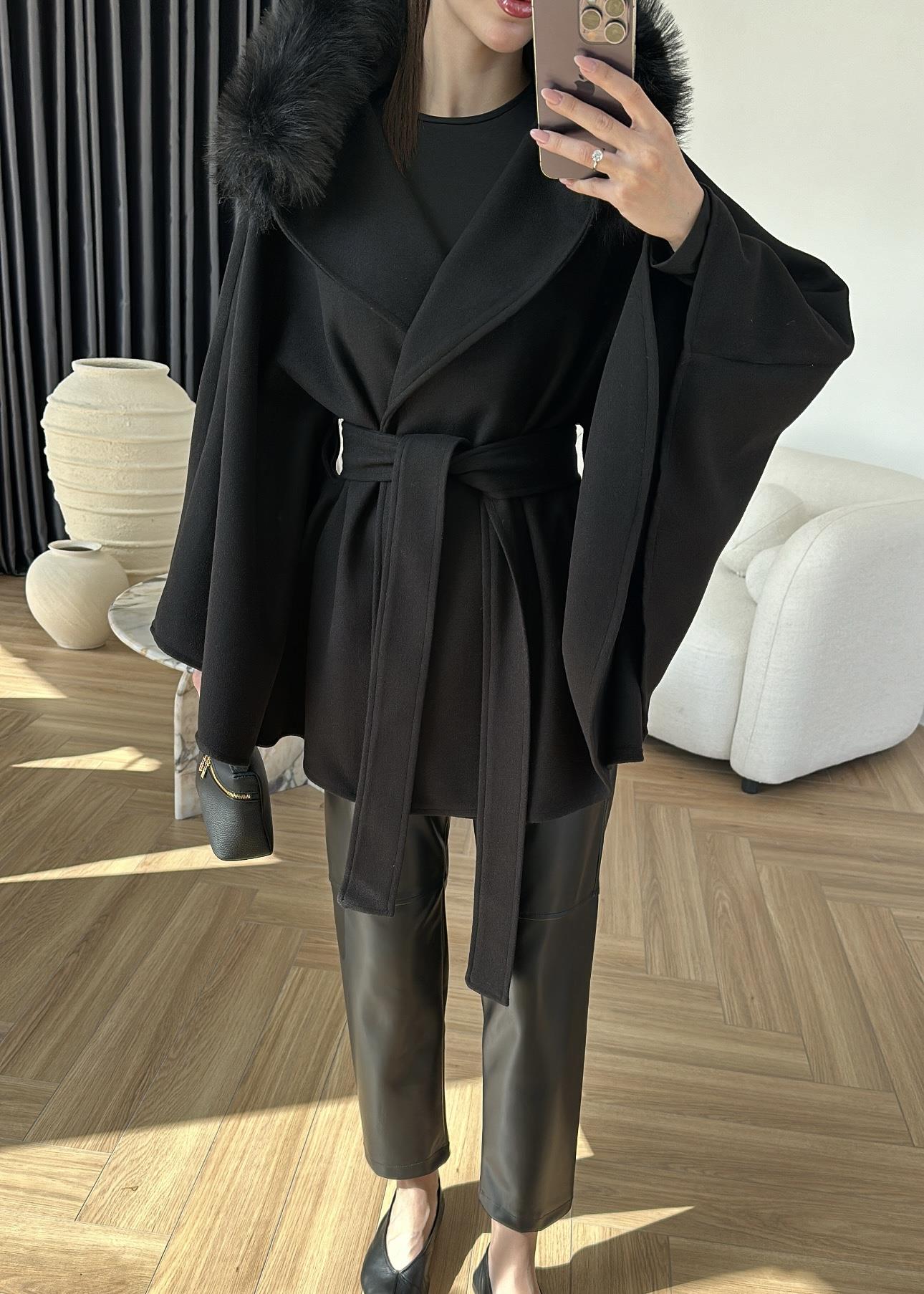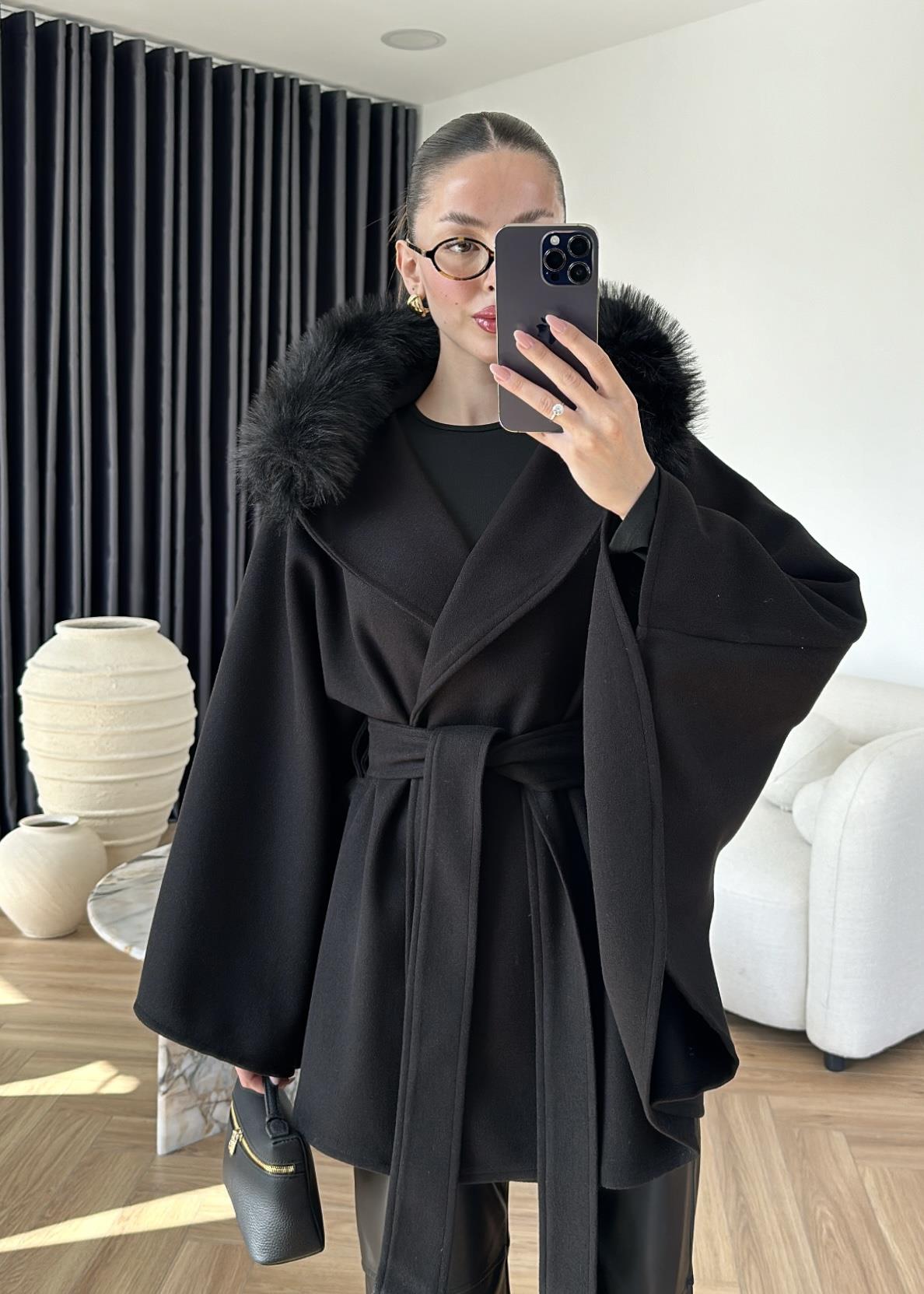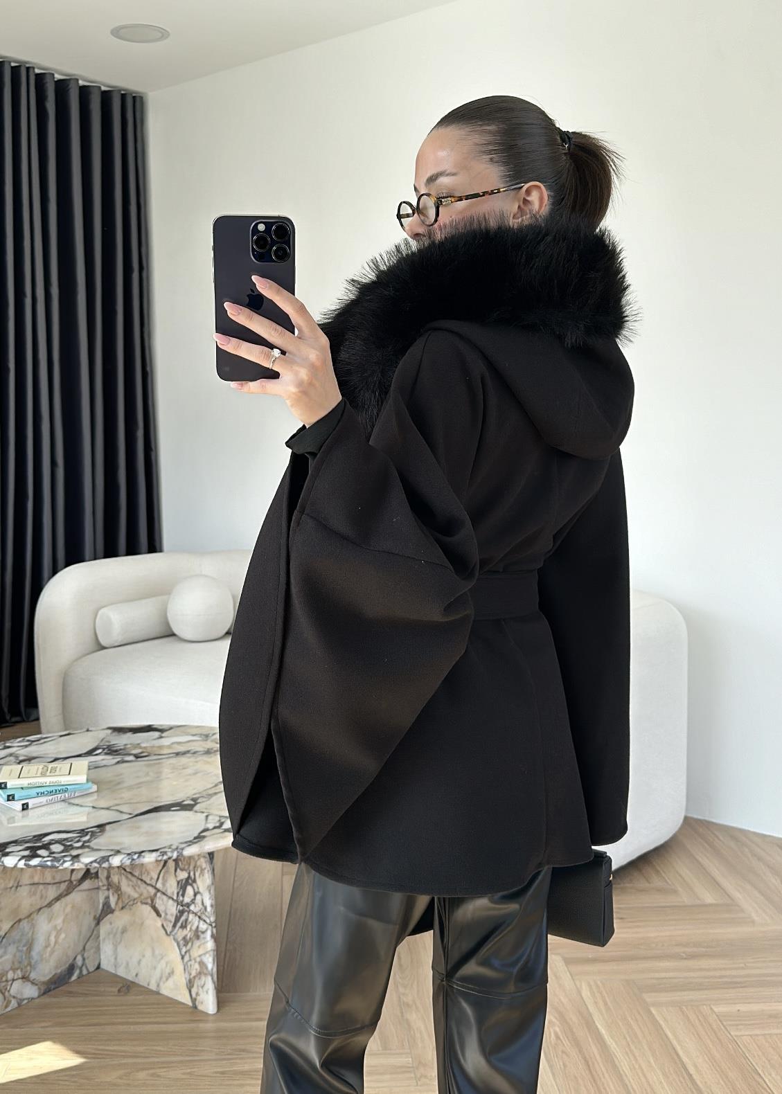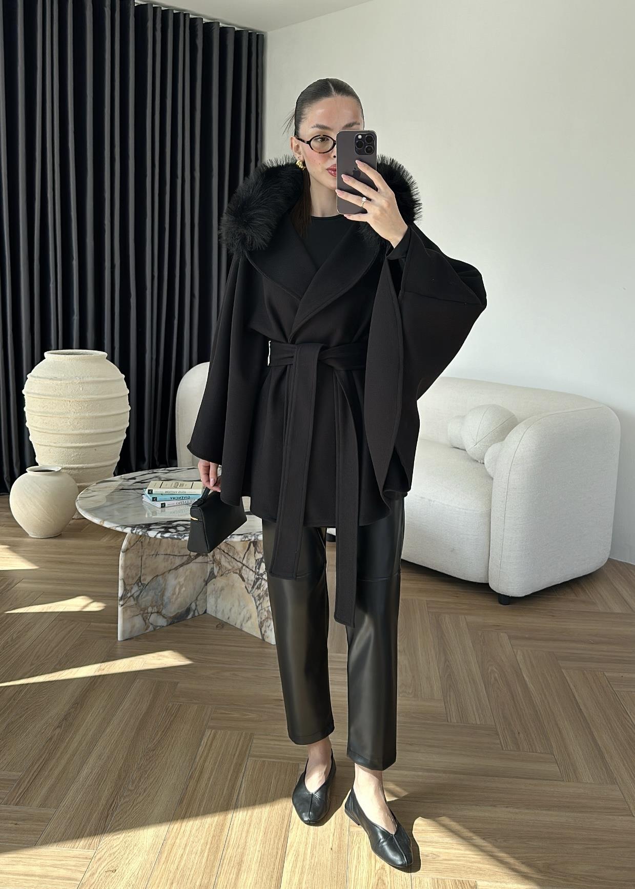 Kapüşonu Kürklü Kaşe Panço (KARGOLANMA TARİHİ 6 EKİM) SİYAH (Gx3698)