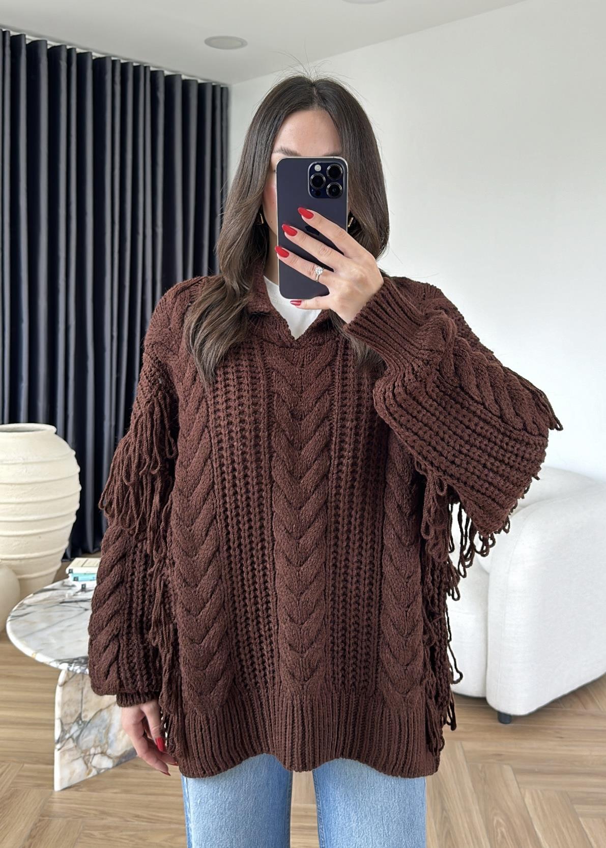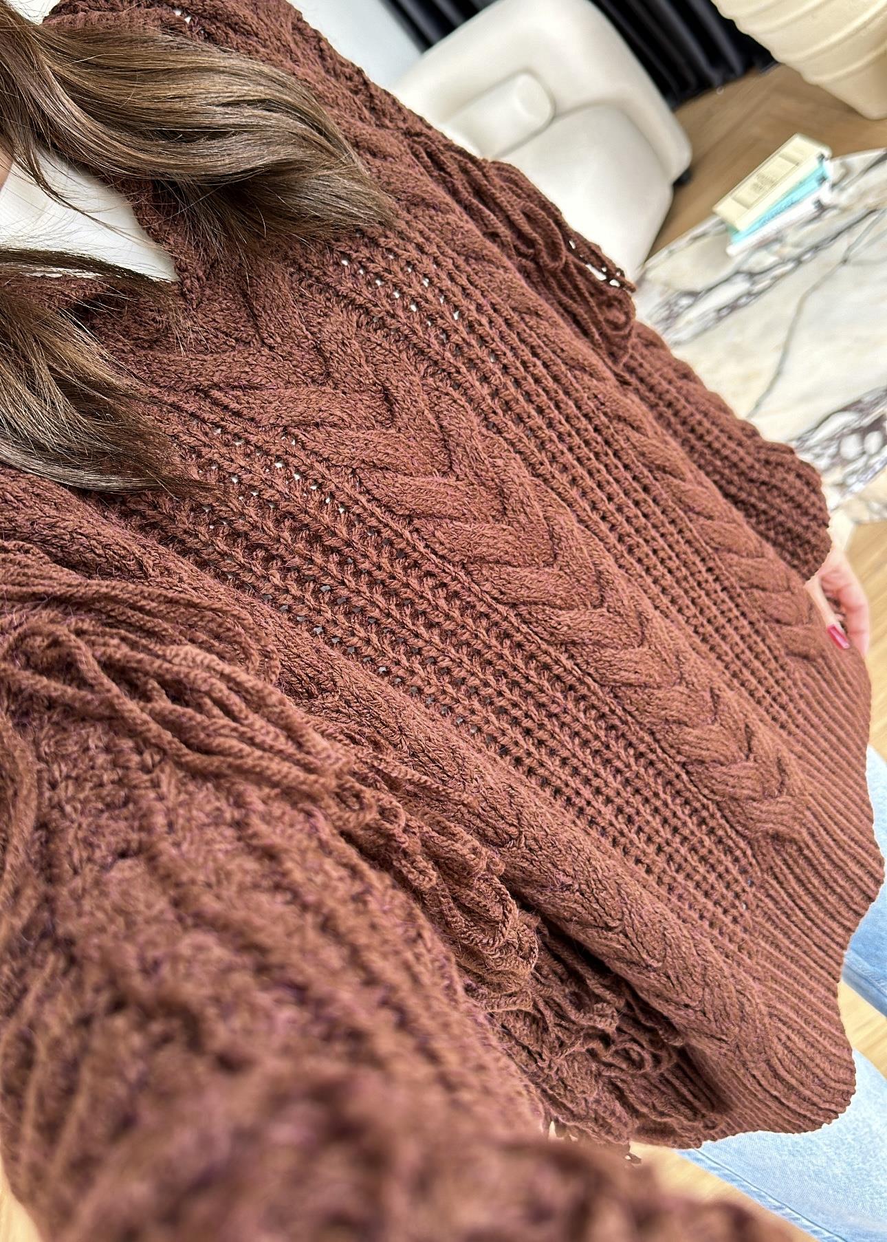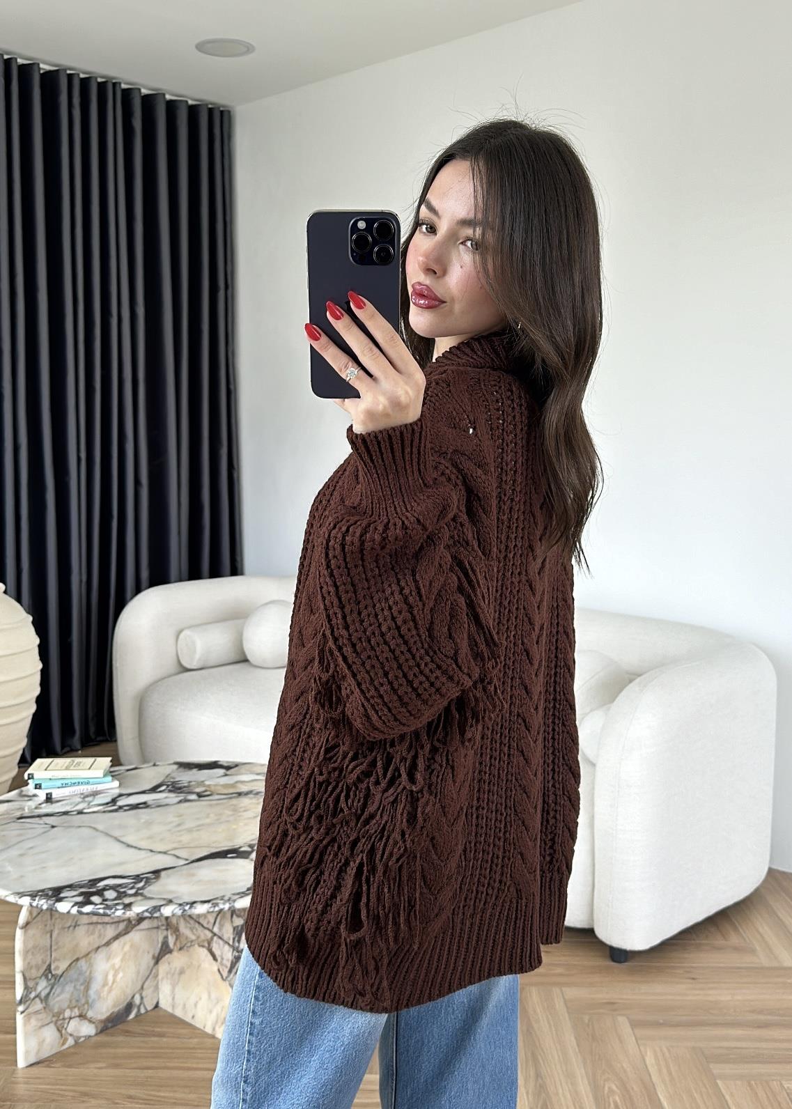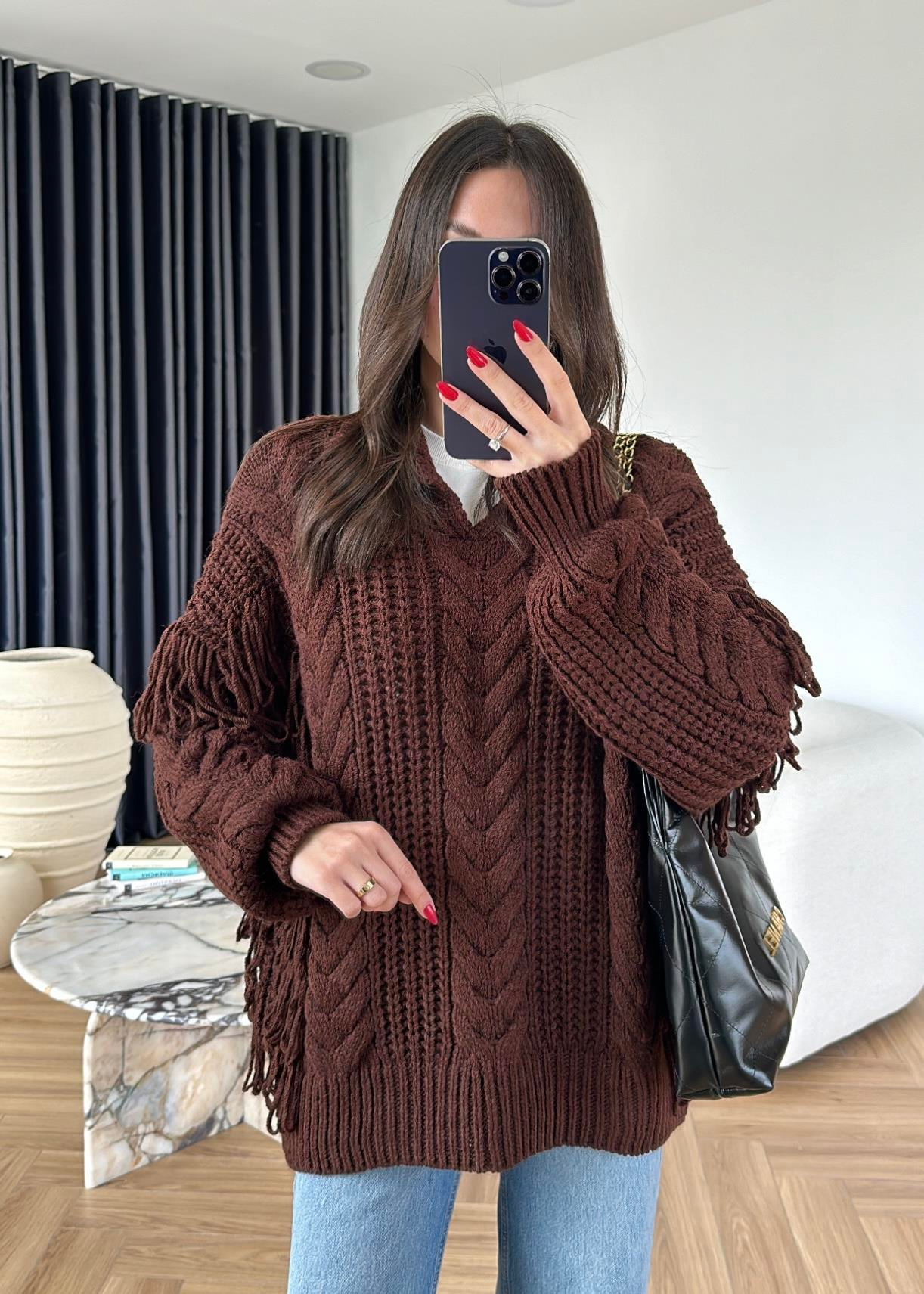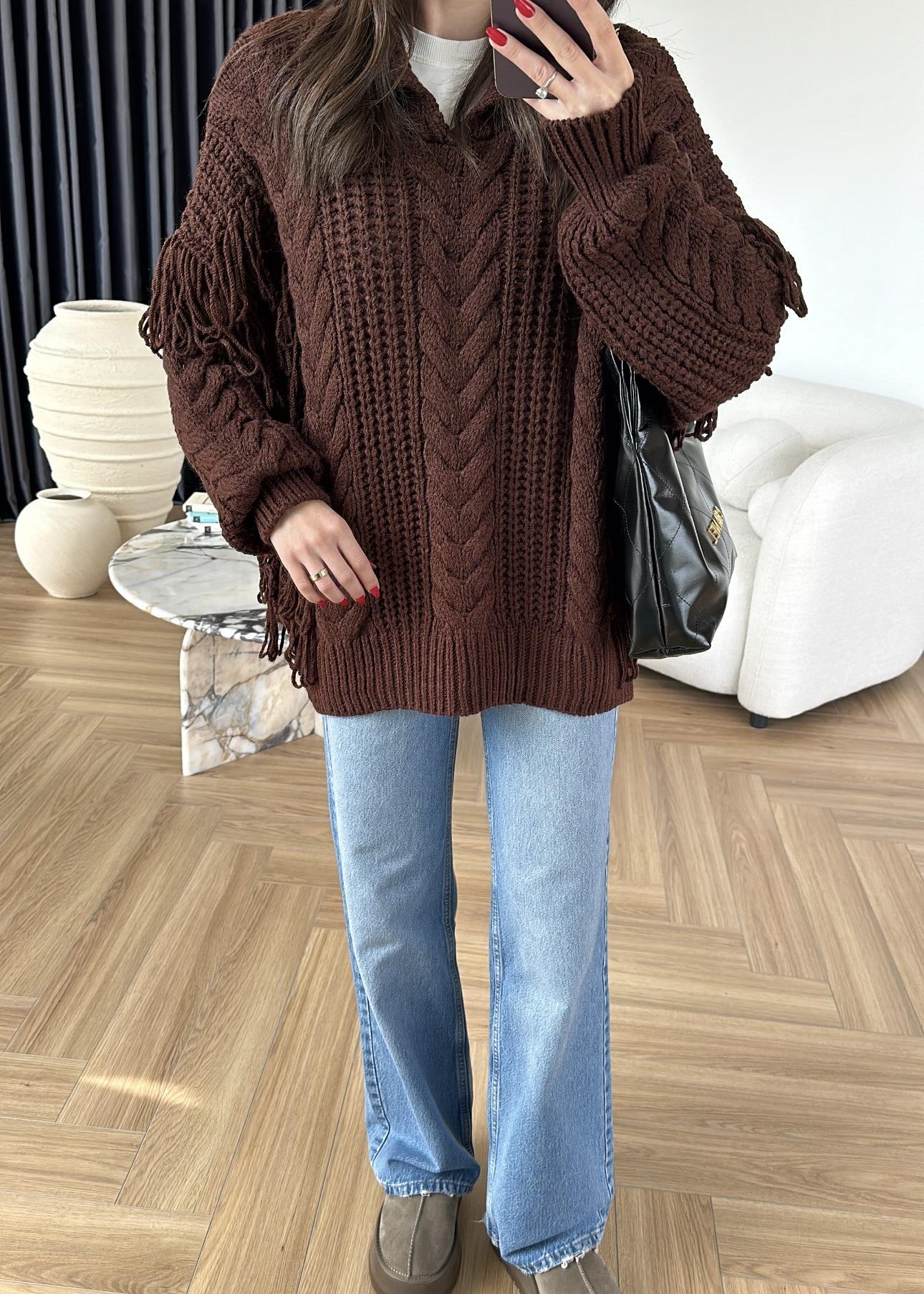 Saçaklı Saç Örgü Kazak ACI KAHVE