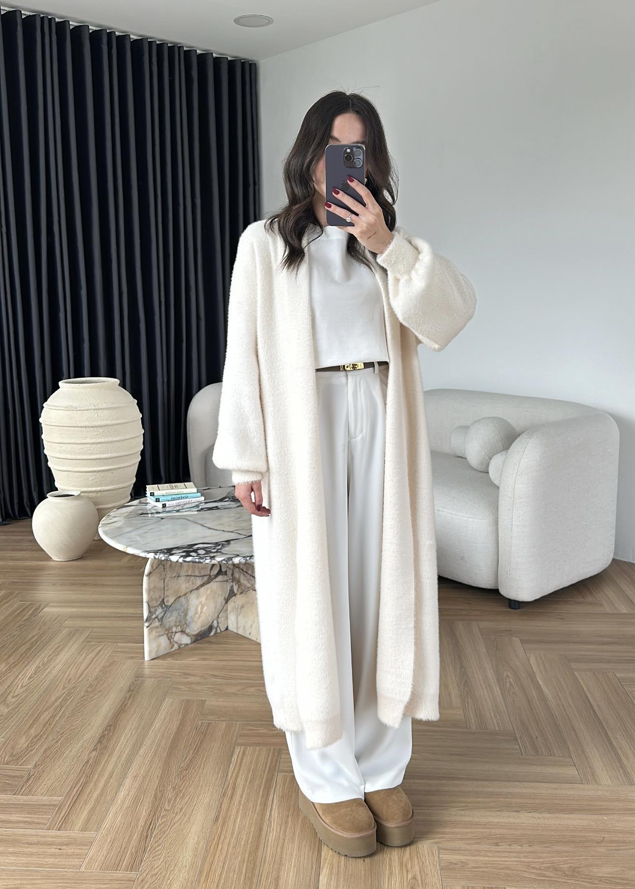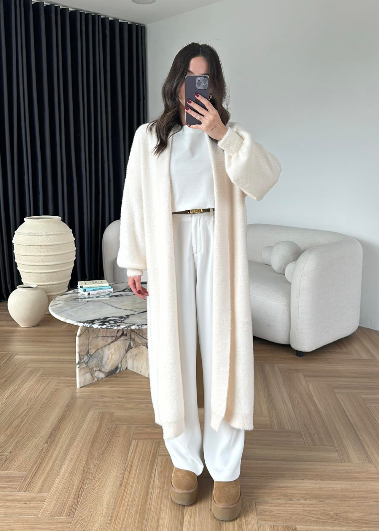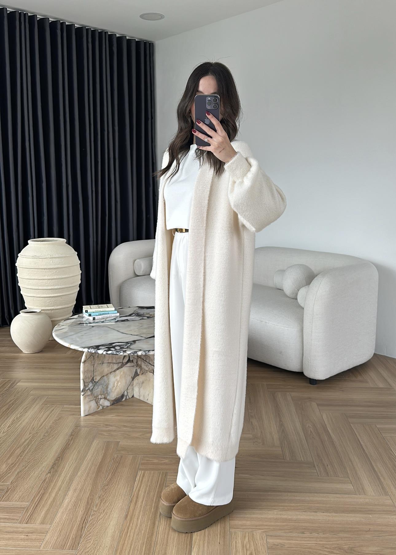 Şal Yakalı Tüylü Uzun Hırka EKRU