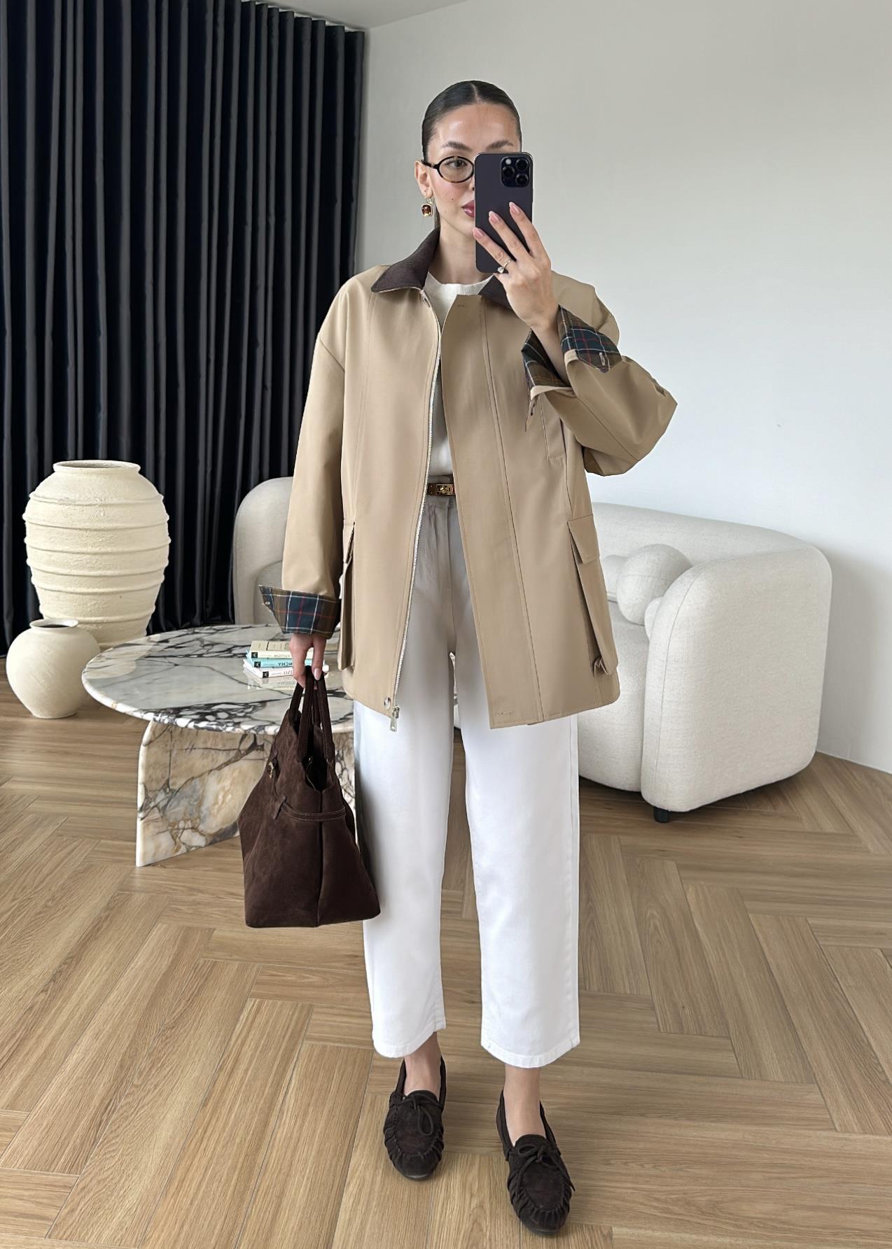 Torba Cepli Ekose Detaylı Ceket BEJ