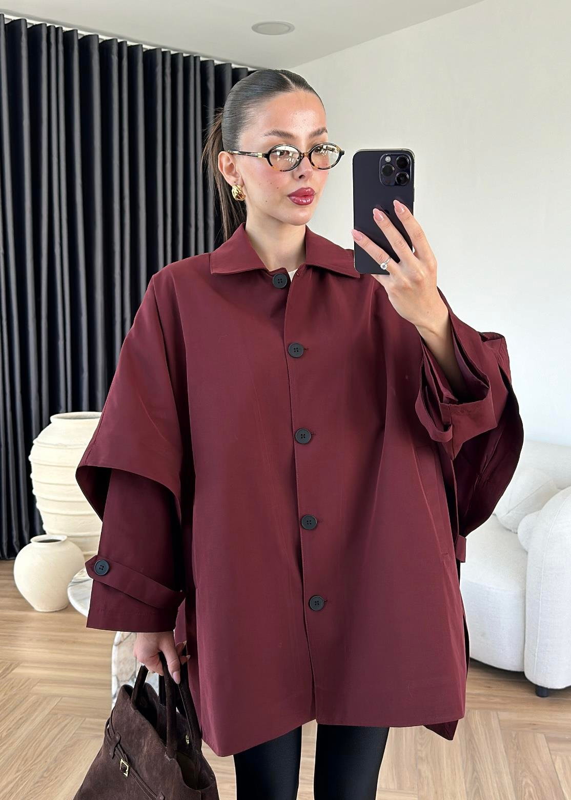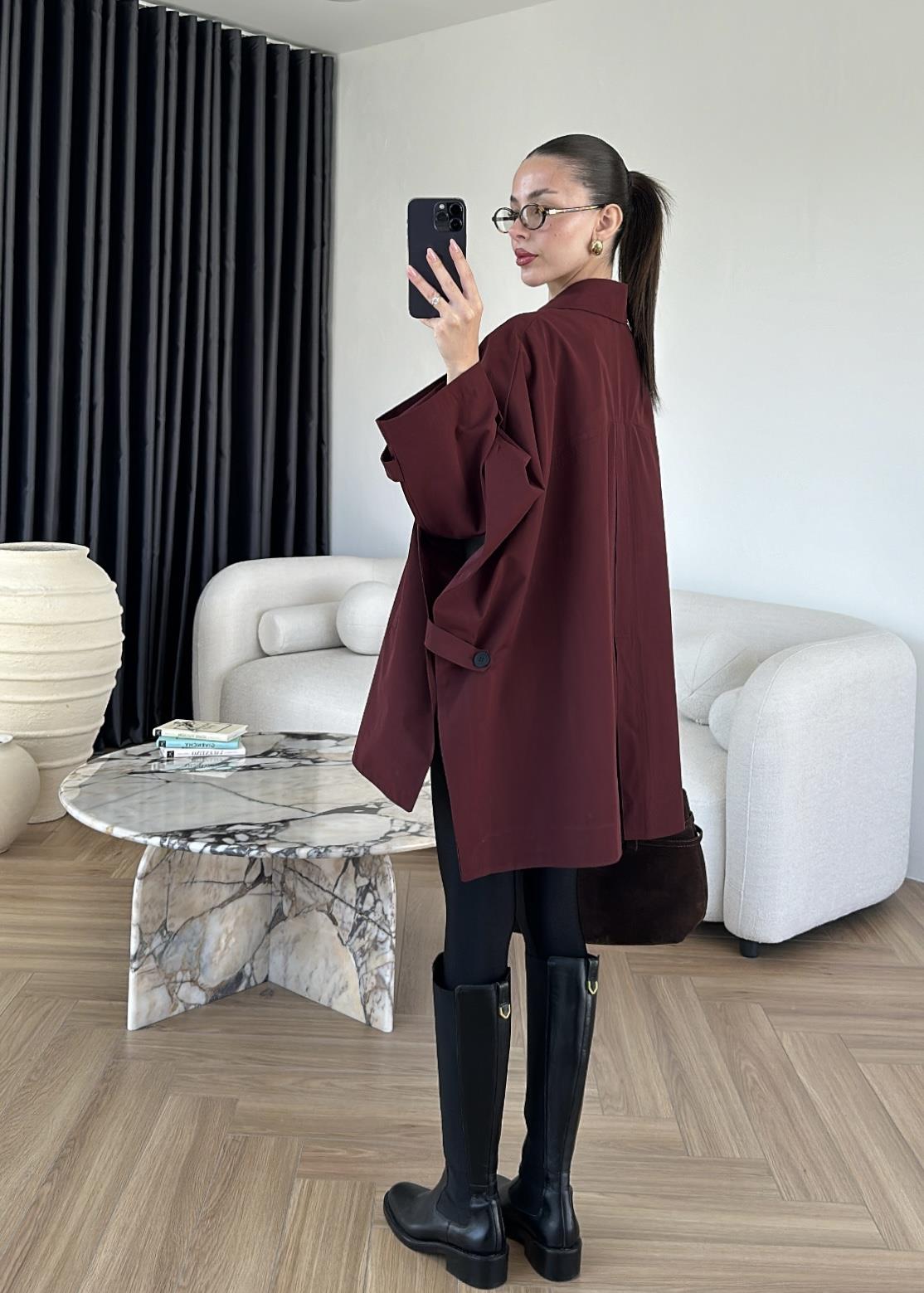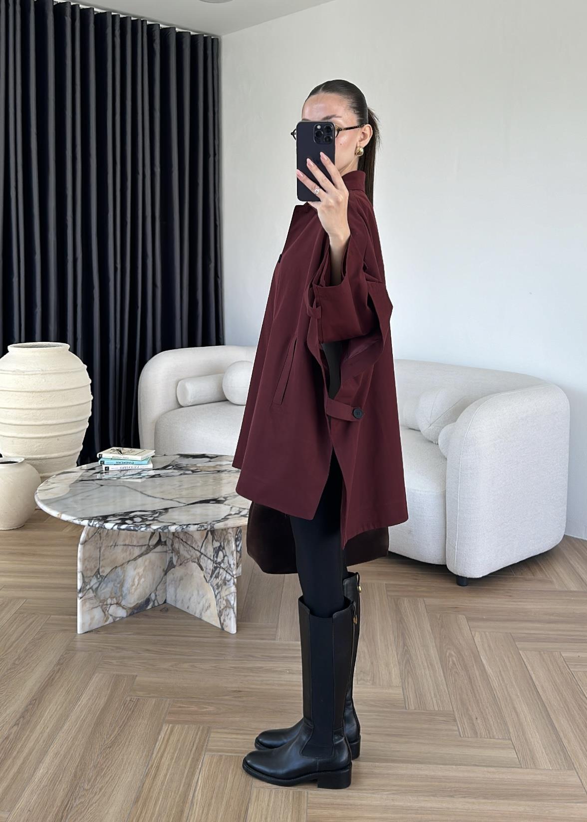 Uzun Kollu Pelerin Trençkot BORDO