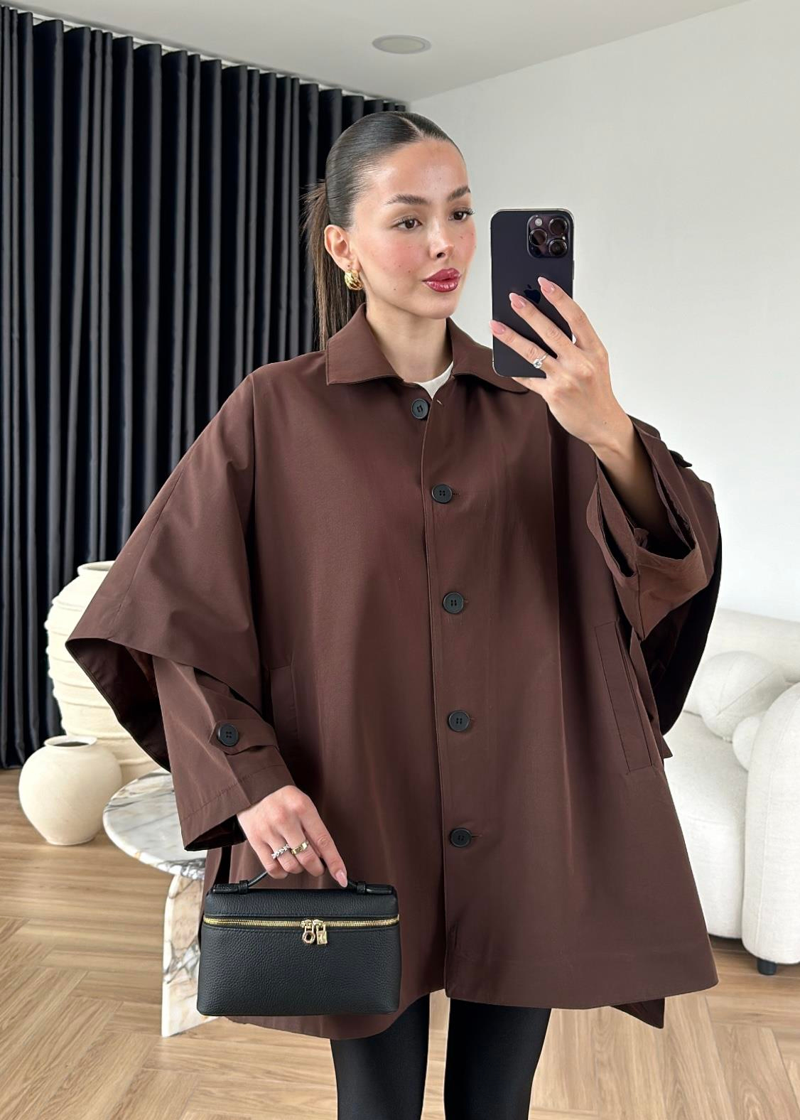Uzun Kollu Pelerin Trençkot KAHVERENGİ