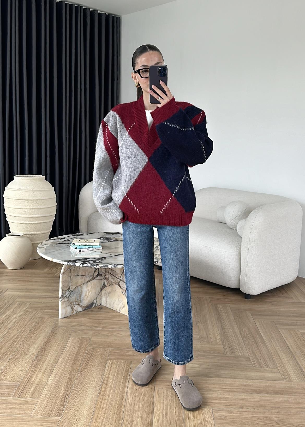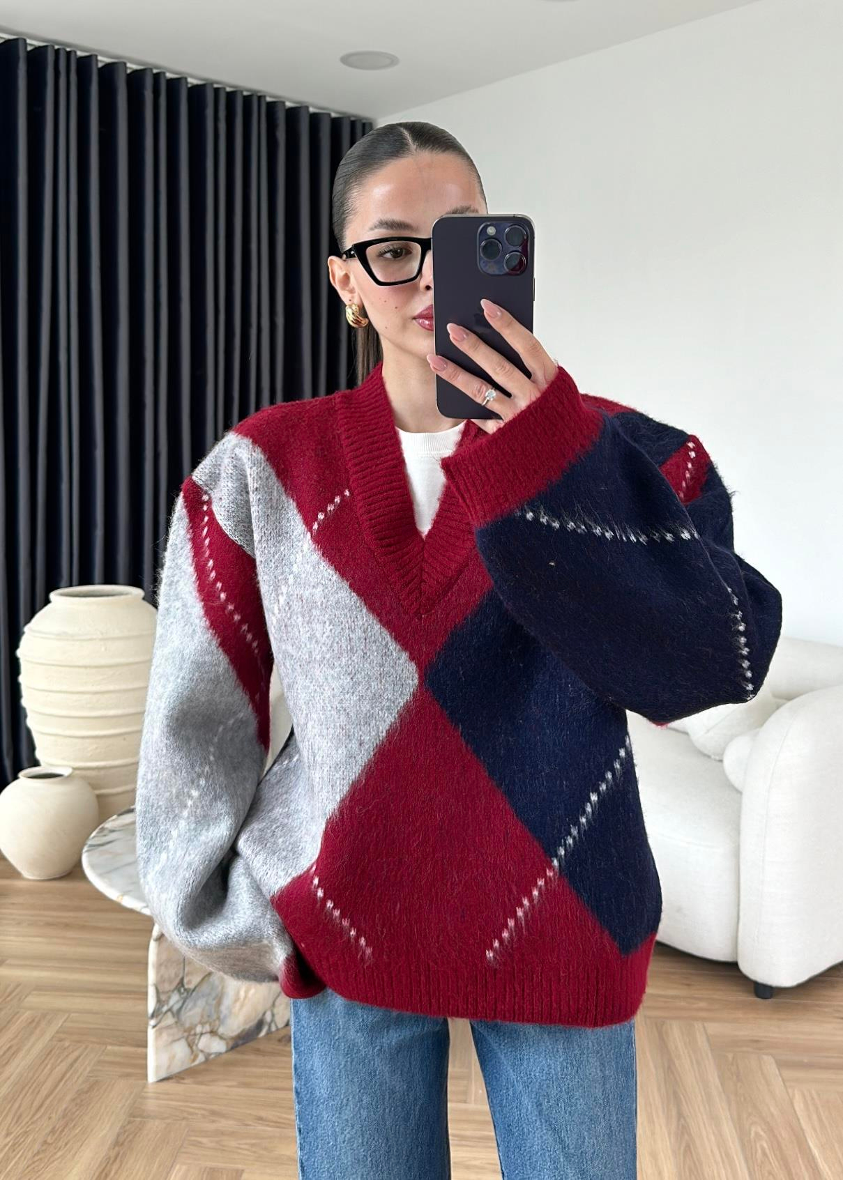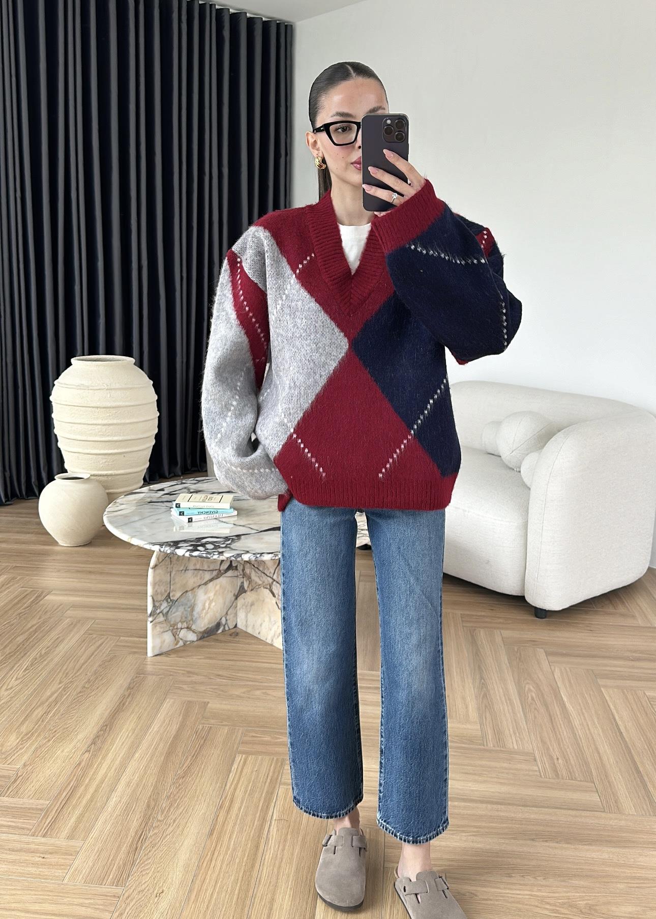 V Yakalı Geniş Baklavalı Kazak KIRMIZI